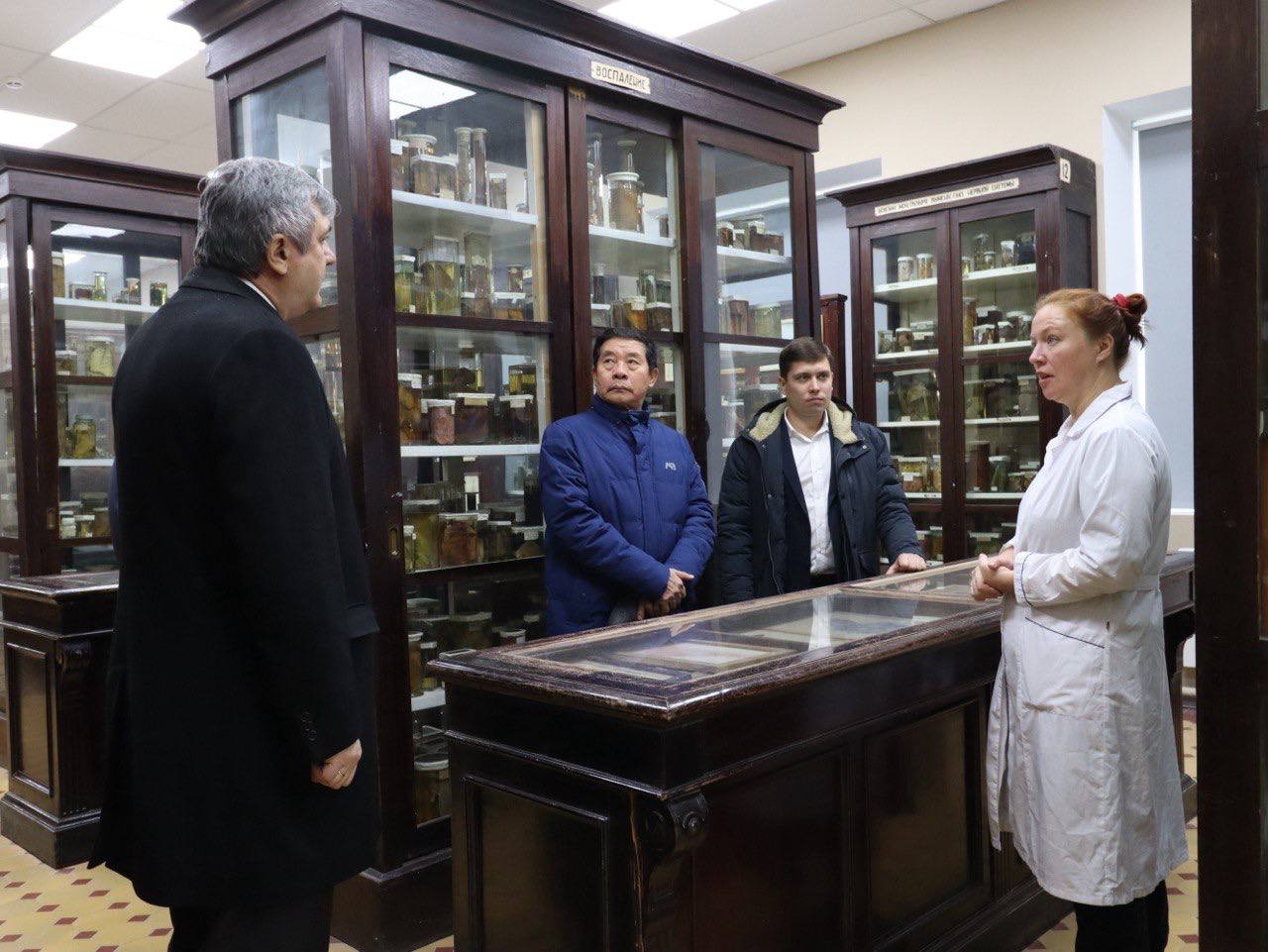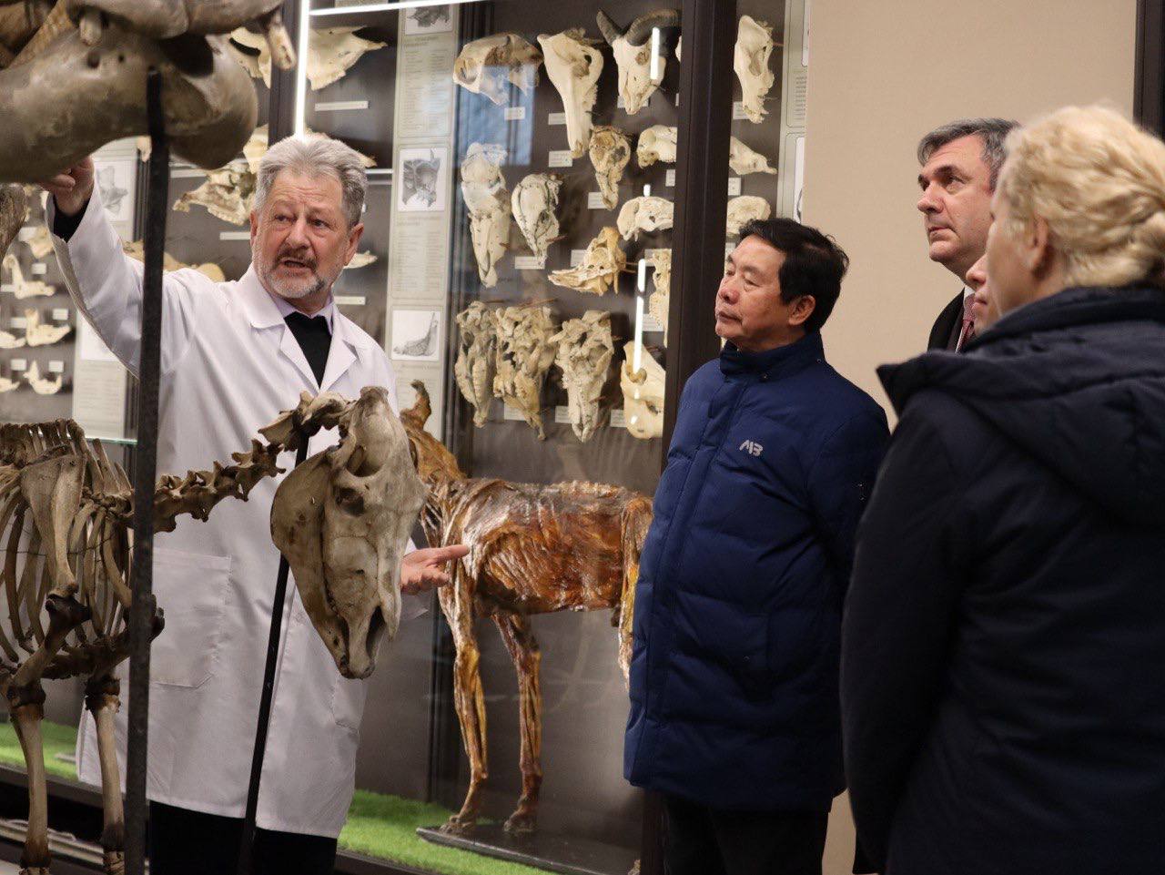 Проректор по научной работе и международным связям Георгий Никитин и начальник отдела международной образовательной деятельности Марина Завершинская провели экскурсию почетному гостю по музею вуза, продемонстрировали научно-исследовательскую базу и образовательный процесс будущих врачей-ветеринаров.