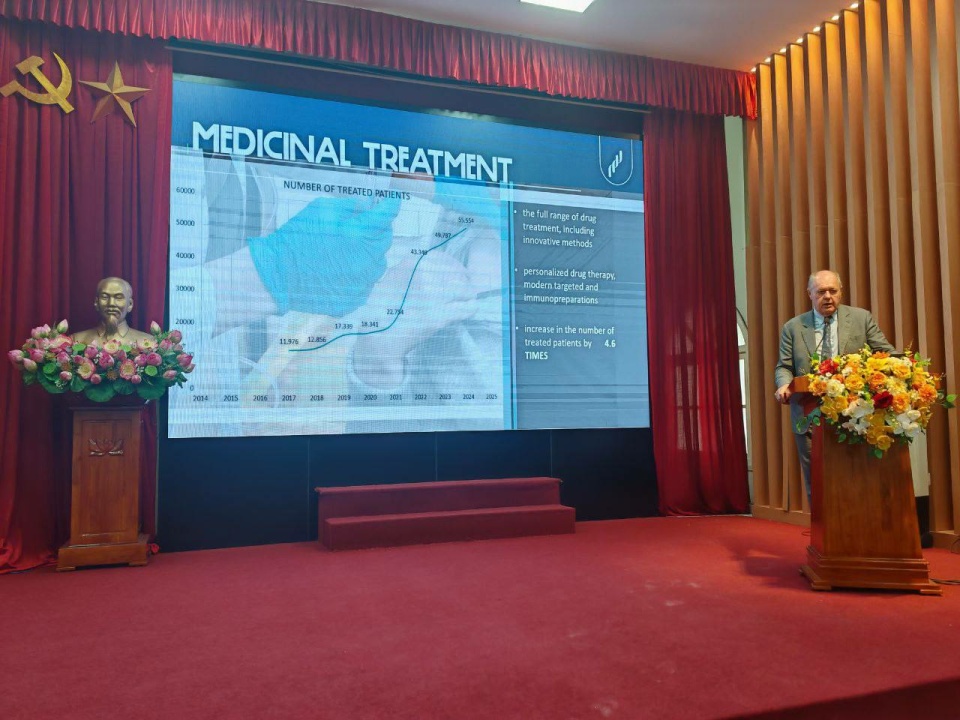 Нгуен Тхе Ань поприветствовал российских коллег и отметил взаимовыгодный характер сотрудничества в сфере медицины и здравоохранения. Он напомнил историю создания больницы «Дружба». Госпиталь был построен советскими специалистами и открылся в 1958 году. За десятилетия своей работы он стал символом дружбы между Вьетнамом и СССР, а затем и Россией. Нгуен Тхе Ань в ходе презентации обратил внимание на важное событие в истории больницы – с рабочим визитом ее посещал первый Президент Вьетнама Хо Ши Мин. Сегодня дело своих предшественников продолжают новые поколения специалистов из России и Вьетнама. Директор больницы «Дружба» обратил внимание на важность обмена опытом и постоянного повышения квалификации медиков для обеспечения качественной и доступной медицинской помощи. Нгуен Тхе Ань выразил уверенность в высоких практических результатах сотрудничества с российскими коллегами в области онкологии, интенсивной терапии и клинической фармакологии.