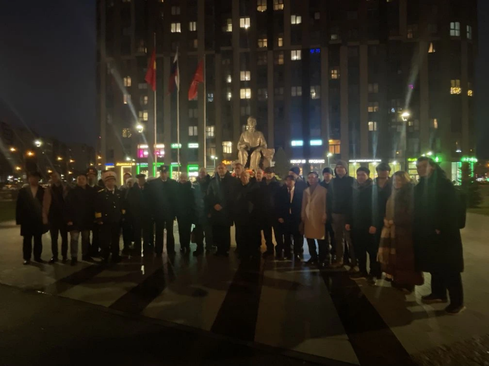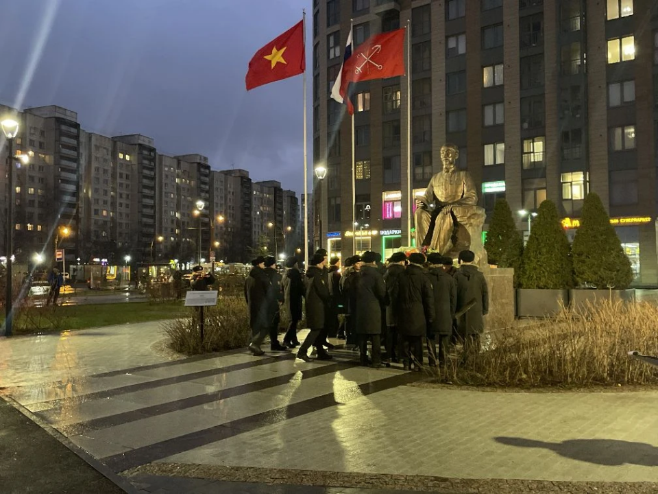 К подножию памятника вьетнамскому лидеру на площади Хошимина цветы возложили заместитель председателя Комитета по внешним связям Санкт‑Петербурга Вячеслав Калганов и начальник отдела организационной работы и взаимодействия с органами местного самоуправления администрации выборгского района Павел Михайлов, глава вьетнамской общины города Зыонг Ти Киен и председатель Санкт Петербургского отделения Межрегиональной общественной организации ветеранов войны во Вьетнаме полковник Алексей Скреблюков.