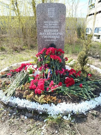 Затем состоялось возложение цветов к памятному знаку на месте захоронения В. М. Головнина на территории Митрофаниевского кладбища.